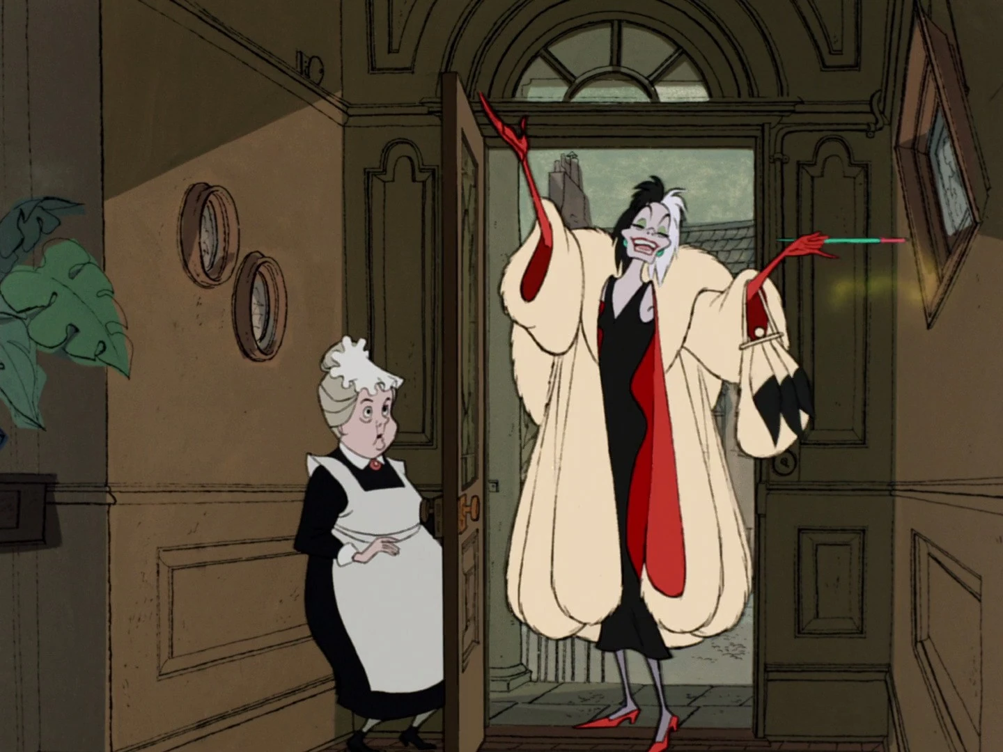 A while after Roger and Anita have married and settled down together, Perdita, Anita's Dalmatian, hears the screech of Cruella's car outside, and runs to the kitchen to hide from "that devil woman." Looking out of the window, Roger sees that Cruella, whom he refers to as Anita's old schoolmate, is coming towards the house. As she approaches the front door, Roger sings a less-than-flattering song about her. Anita attempts to stop Roger for fear that Cruella might hear. Roger goes upstairs and uses various musical instruments to play the tune to the song when Cruella bursts in, demanding to see Pongo and Perdita's puppies and leave a smoke trail from her cigarette. During her visit, Cruella expresses her love for fur, especially that of a Dalmatian (though she never elaborates on her plans), and also mocks Anita's choice of marrying Roger and their house. Anita informs Cruella that the Dalmatian puppies will not arrive for a few weeks. Cruella then departs as quickly and loudly as she came, saying that she will return in three weeks. A previously excited Perdita grows anxious at Cruella's interest in the puppies, knowing that Cruella would never be a benevolent dog owner.