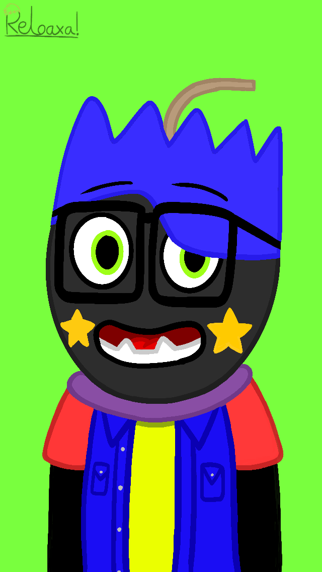 George is a Humanoid Bombhead, with black skin all over his body, except his head, which is an old dark grey bomb, with a few tiny specks of rust, on top of a purple collar on his body which can be removed and even explode, but George can always regenerate spares. On his face, he has green eyes and he wears rounded square glasses. He also had a red mouth (now purple) and pure white teeth with a two-tooth underbite. He also has yellow star tattoos on his cheeks. He has blue spiky hair on the top of his head with his bomb fuse sticking out of the top. He has short arms with four fingered hands and short legs with four toed feet. His normal outfit consists of a lime green t-shirt with reddish-pink short sleeves and the words "Zap Cloud" on it, coral hoodie (formerly a sleeveless denim jacket), jeans, green socks and white and green DC trainers with black laces on them. He sometimes wears a purple Moncler coat, but it's not prominent to his main outfit.