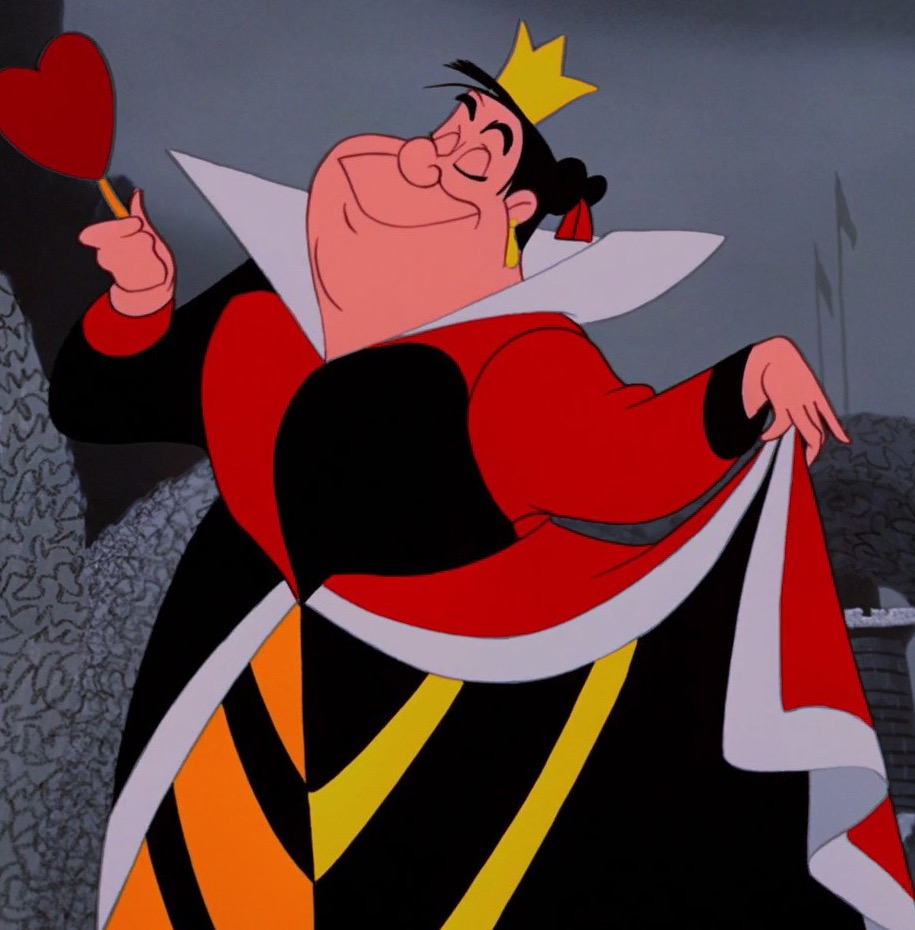 Among Disney's animated rogues gallery, the Queen of Hearts is easily recognized by her iconic red, black, and gold color scheme—as well as her motif of hearts and playing cards. Backed by her iconography, and catchphrase, "Off with their heads!", she serves as one of the primary members of the Disney Villains franchise.
