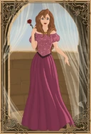 In her Queen attire, she wears a crown of pink roses on her head, golden teardrop-shaped earrings, a magenta choker, and short silver laced gloves. For her dress, it is an ankle-length white dress with sparkly off-the-shoulder purple sleeves that are see-through and outlined with a golden trim. There is also a yellow rose on the center of the sleeves and on the top of the dress. Additionally, Mayora wears a pair of white ballet shoes along with light blue eyeshadow and light pink lipstick.